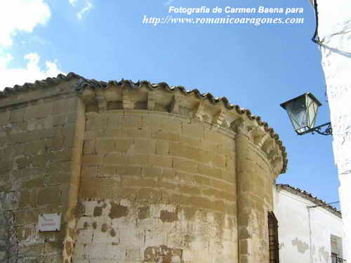Al exterior queda visible parte del ábside, que sería de tres tramos, separados por dos columnas adosadas. La más septentrional queda oculta en la casa colindante. Posee un ancho zócalo de 62 cm. de alto. La columna está formada por un plinto de la misma altura que el zócalo, un fuste de tambores lisos y homogéneos y un sencillo capitel corintio (Imagen 1 y 4).