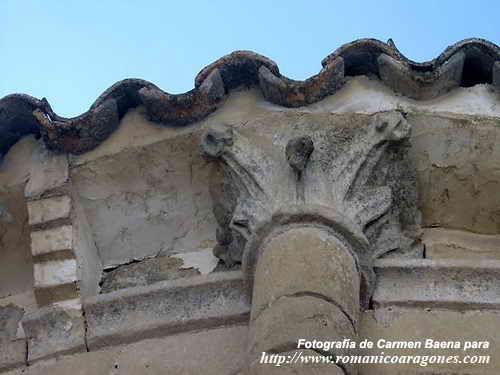 Una imposta en forma de nacela recorre todo el ábside y en ella apoyan los sencillos canecillos de rollo y nacela que soportan la cornisa (Imagen 3). Hay otros canecillos escalonados que no parecen originales (Imagen 4).