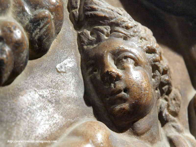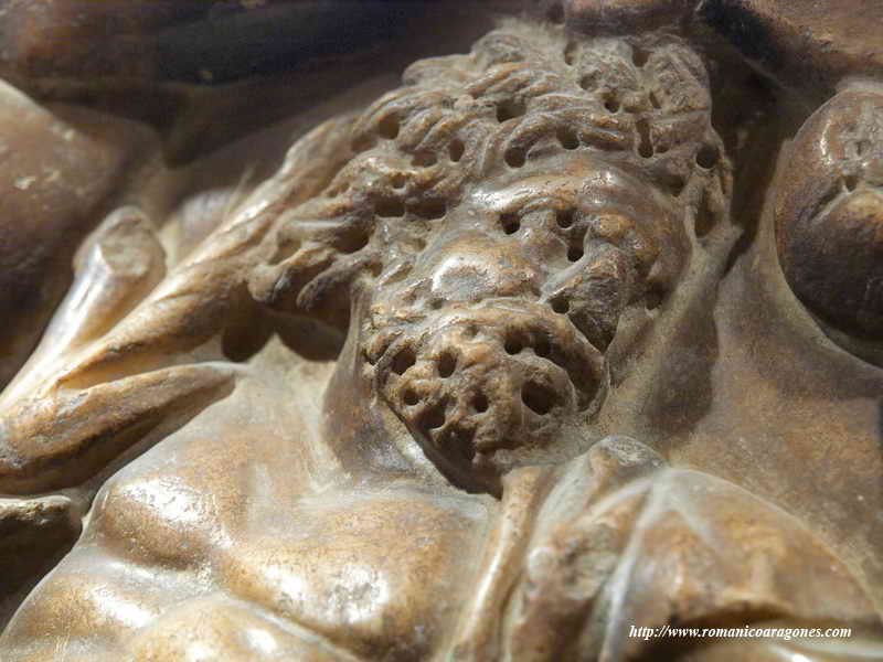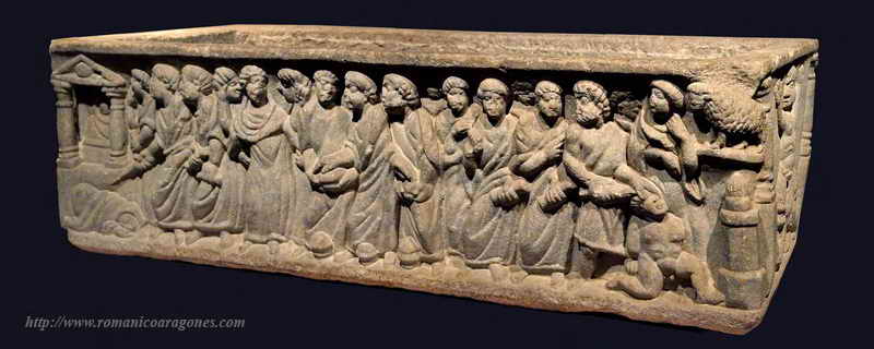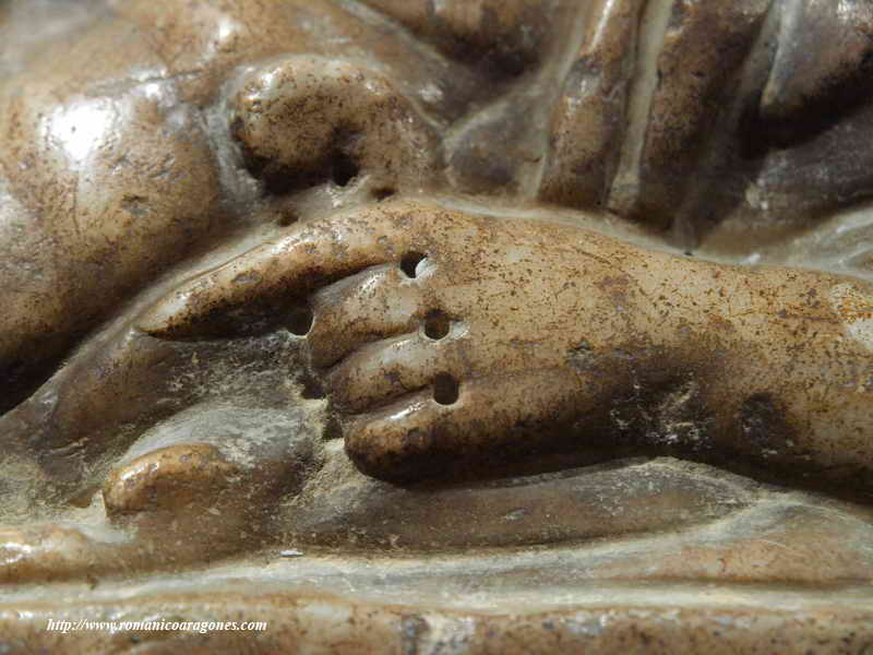 Las imágenes 2 a 5 corresponden al sarcófago paleocristiano en el que descansan los restos del rey Ramiro II de Aragón en el monasterio de San Pedro el Viejo de Huesca. resalto en el mismo el tratamiento a trépano dado a los ojos, como hiciera el maestro de Cabestany. Uso intensivo del trépano que define puntos anatómicos sobre los que trabajar el bloque capaz, como ocurre en la imagen 5.